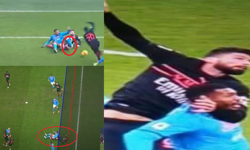 - Giroud nel saltare di testa stringe al collo Juan Jesus impedendogli di saltare. Già qui andava interrotto il gioco per la ‘cravatta’ dell’attaccante del Milan al difensore del Napoli.