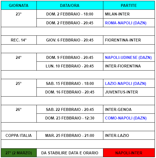 Questo il calendario di Napoli e Inter fino allo scontro diretto della 27° giornata.