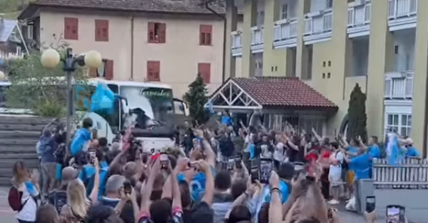 Ma a Dimaro Folgarida non è mancato neanche il travolgente entusiasmo dei tifosi che ha abbracciato la squadra all’arrivo all’hotel che la ospita in Val di Sole. Tifosi arrivati da tutte le parti d’Italia che hanno atteso la squadra per molto tempo pur di abbracciare i CAM-PIO-NI D’ITA-LIA.