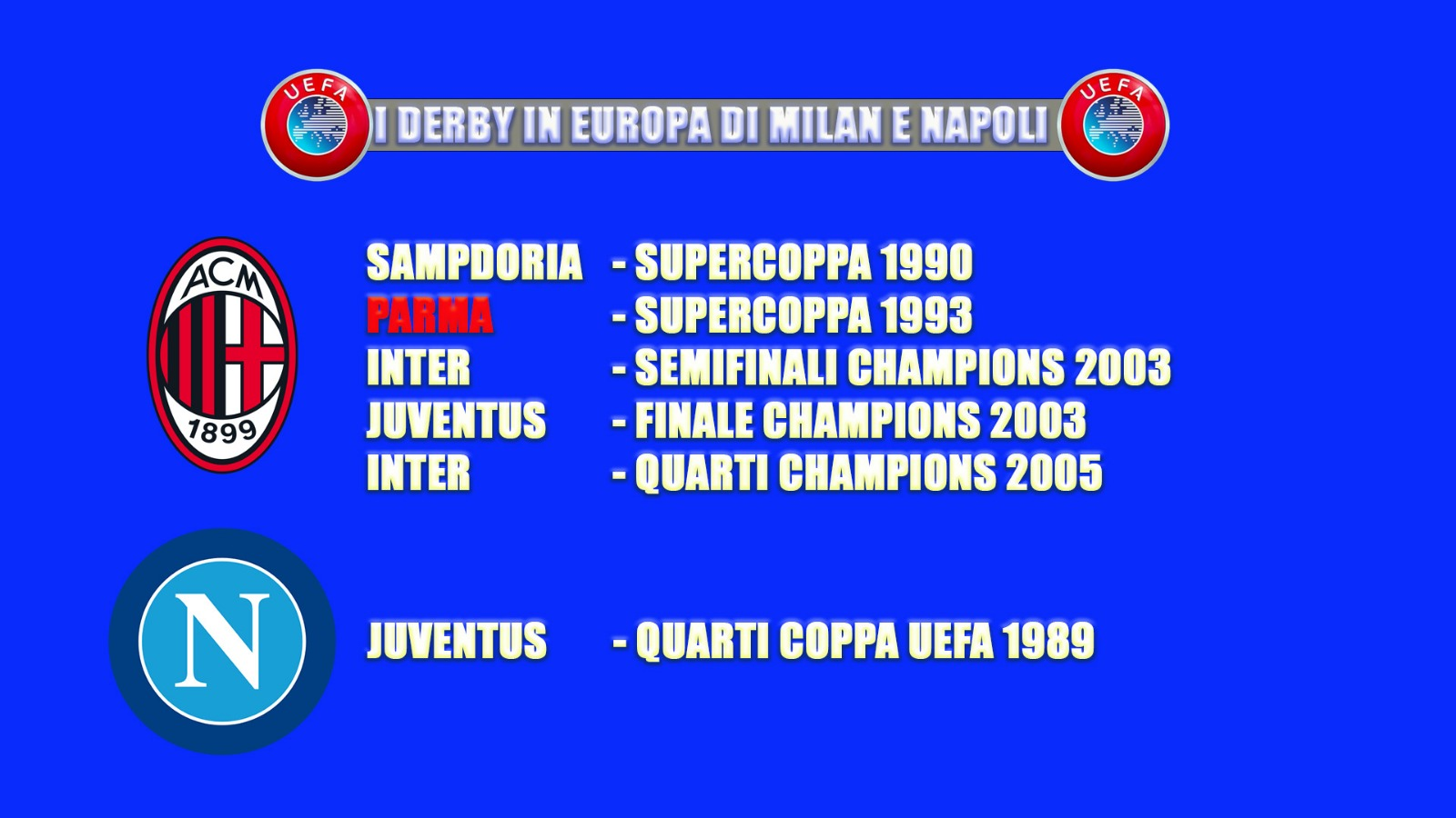Un solo ‘derby’ per il Napoli in Europa e che derby. Nella stagione 1988-89 il Napoli di Maradona ha eliminato la Juventus nei quarti di finale di Coppa UEFA, poi vinta dagli azzurri, ribaltando al Maradona lo 0-2 dell’andata a Torino. Il gol decisivo del 3-0 al Maradona segnato da Alessandro Renica al 119′ del secondo tempo supplementare.