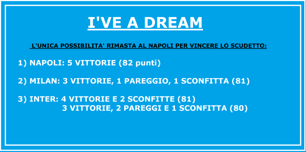 Arrivando a pari punti con l’Inter il Napoli sarebbe secondo, arrivando a pari punti sia con l’Inter che con il Milan il Napoli sarebbe addirittura terzo. Finendo invece il campionato a pari punti con il Milan lo scudetto si giocherebbe sulla differenza reti e non sulla miglior difesa…