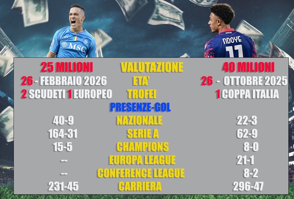 Ovviamente il tifoso nel leggere queste cifre, si chiede come sia possibile tale differenza se è Raspadori ad aver vinto 2 Scudetti e ad aver segnato di più (media gol di Raspadori 1 ogni 5,13 partite, media gol di Ndoye 1 ogni 6,30 partite). Inoltre Raspadori vanta più presenze e più gol di Ndoye anche in Champions League.