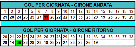Il record di gol è 36 reti della 22° giornata, quello negativo è di 11 reti della 7° giornata.