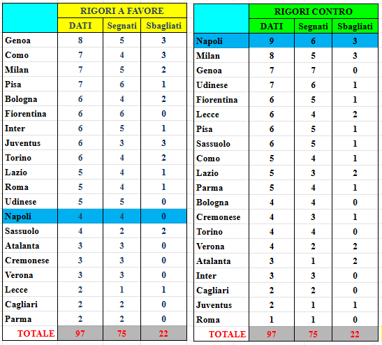 Il Genoa guida la classifica dei rigori a favore (8), mentre il Napoli quella dei rigori fischiati contro (9).
