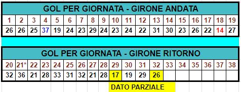 Dopo la 32esima giornata in totale sono state segnate 828 reti (media 2,60 a partita), delle quali 459 dalle squadre di casa e 369 da quelle in trasferta. Ricordiamo che sono dati parziali in attesa di conoscere i risultati di Udinese-Roma e Atalanta-Fiorentina.