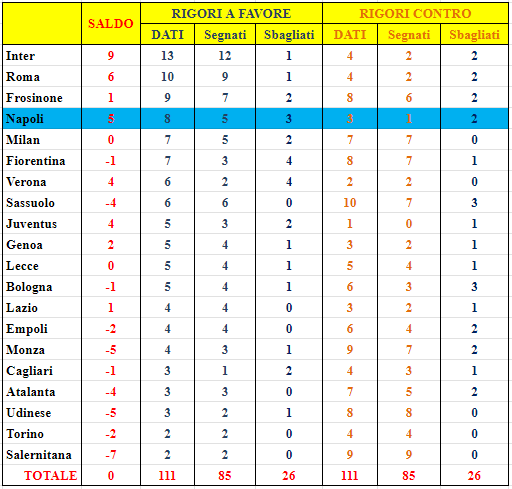 In totale dopo 32 giornate sono 111 i rigori fischiati, dei quali 85 segnati e 26 sbagliati. L’Inter guida la classifica dei rigori a favore (13). Salernitana e Torino le squadre con meno rigori fischiati a favore (2). Il Sassuolo è la squadra con più rigori fischiati contro (10), la Juventus quella con meno rigori fischiati contro (1).