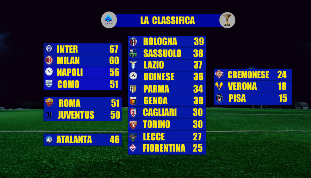 Alle spalle delle milanesi allungo Champions del Napoli che batte in casa il Torino e si porta a +5 sul quarto posto occupato dalla sorpresa Como e dalla Roma sconfitta dal Genoa di De Rossi. La Juventus vince facile con il fanalino di coda Pisa ma è ancora fuori dalla zona Champions che invece inizia ad allontanarsi per l’Atalanta.