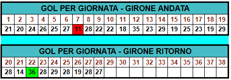 Il record di gol è 36 reti della 22° giornata, quello negativo è di 11 reti della 7° giornata.