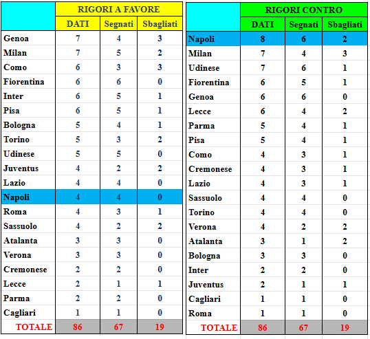 Milan e Genoa guidano la classifica dei rigori a favore (7), mentre il Napoli è primo in quella dei rigori fischiati contro (8).
