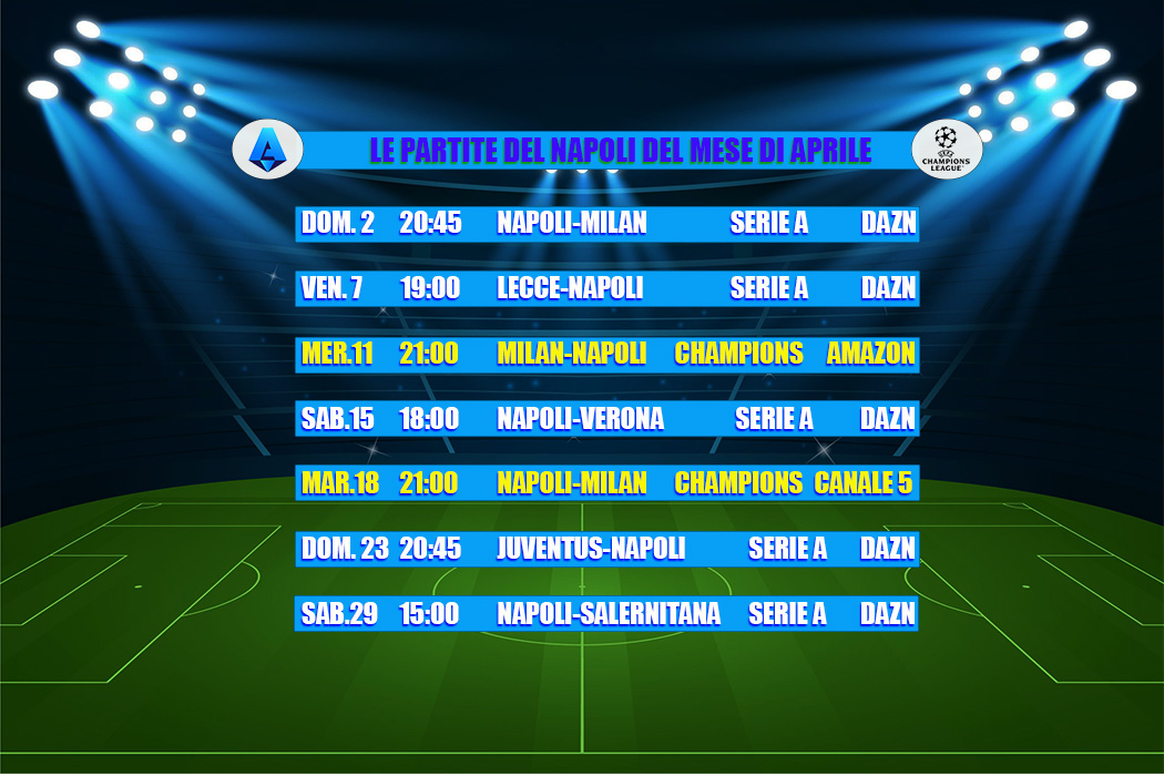 Mese di Aprile che vedrà il Napoli in campo in 5 partite di campionato (3 in casa e 2 in trasferta) e nelle due gare di andata (a Milano) e ritorno (al Maradona) contro il Milan nei quarti di finale di Champions.