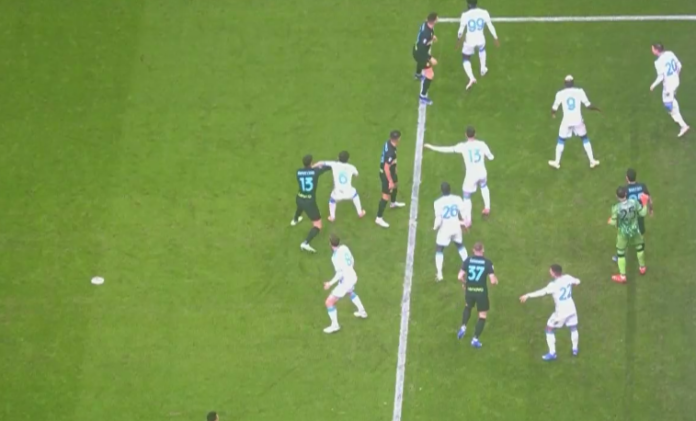 • l’incredibile effetto del pallone dopo la deviazione di Handonovic sul colpo di testa di Mario Rui;