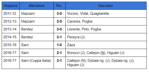 Da quando la Juventus gioca allo Stadium, dalla stagione 2011-12, ha sempre battuto il Napoli in casa. Per gli azzurri sette partite giocate e sette sconfitte, con appena 3 gol segnati e ben 17 subìti.