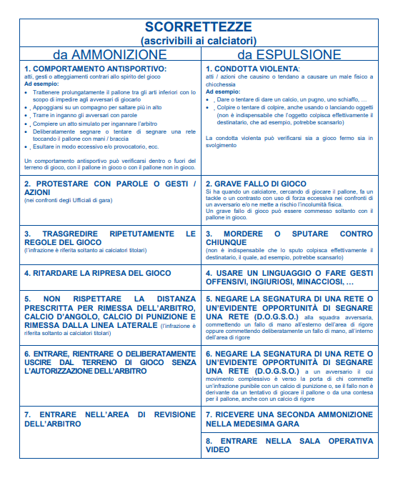 NELLA TABELLA SEGUENTE SONO INDICATI QUANDO SONO PREVISTE AMMONIZIONI ED ESPULSIONI PER FALLI E SCORRETTEZZE.
