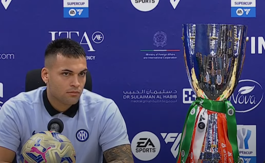 Il calciatore dell’Inter Lautaro Martinez, con l’allenatore Simone Inzaghi, ha presentato la finale della Supercoppa Italiana in programma domani a Riyad in Arabia Saudita contro il Napoli.