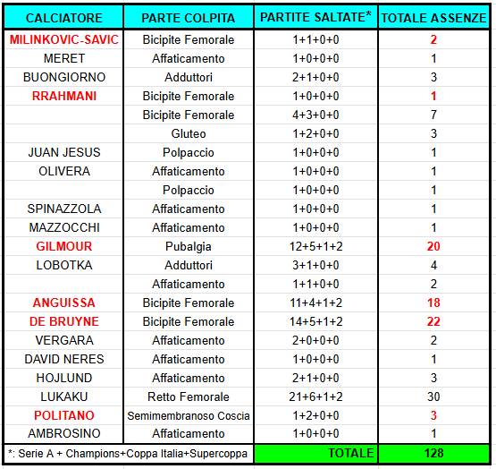 Nella tabella successiva riepiloghiamo i tanti infortuni muscolari che hanno condizionato (finora) la stagione del Napoli (in rosso i calciatori ancora ai box per problemi muscolari).