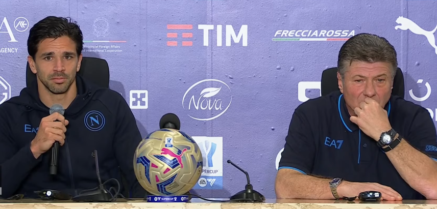 L’attaccante del Napoli Giovanni Simeone, con l’allenatore Walter Mazzarri, in conferenza stampa ha presentato la semifinale di Supercoppa Italiana in programma domani a Riyad contro la Fiorentina.